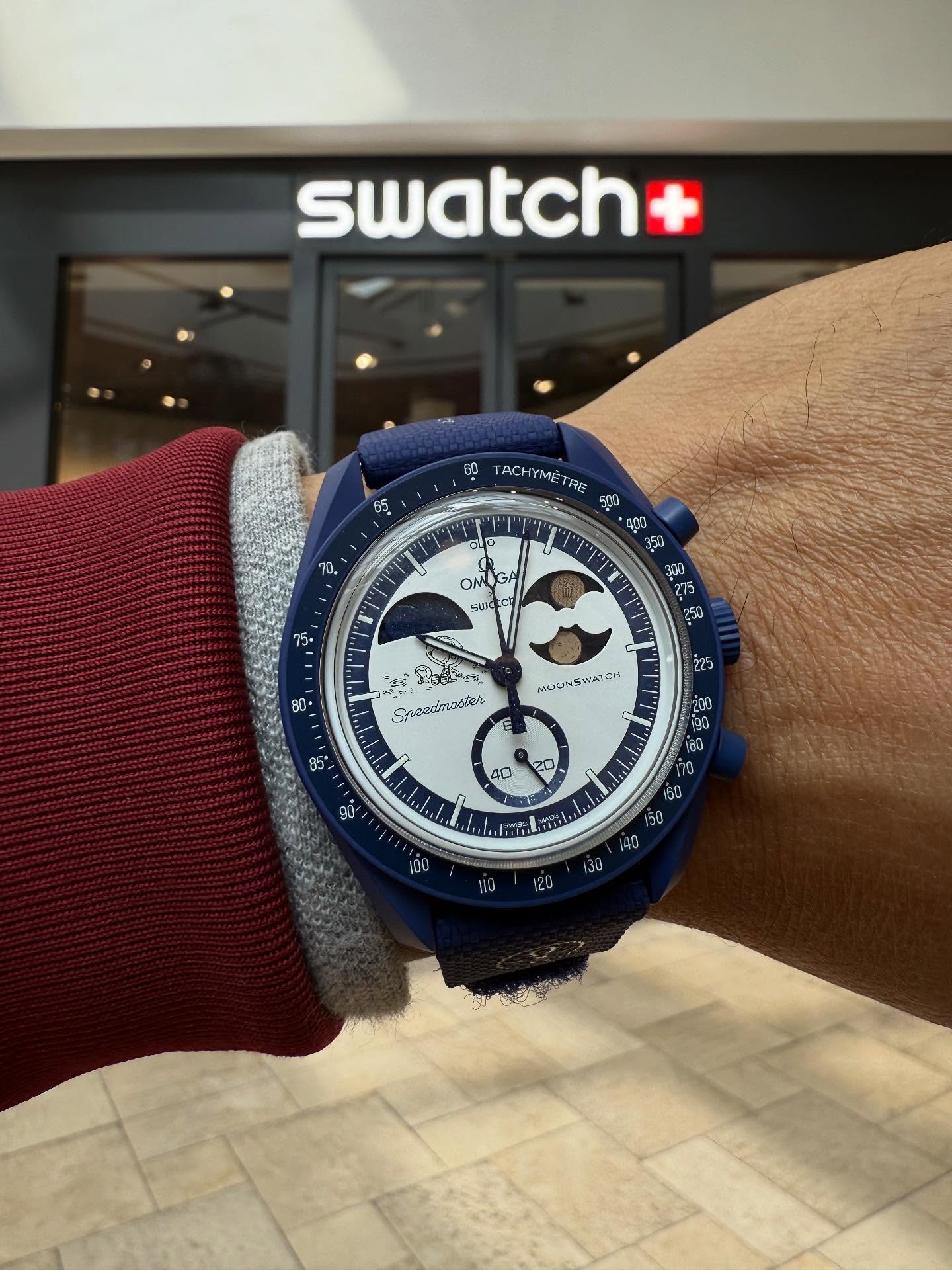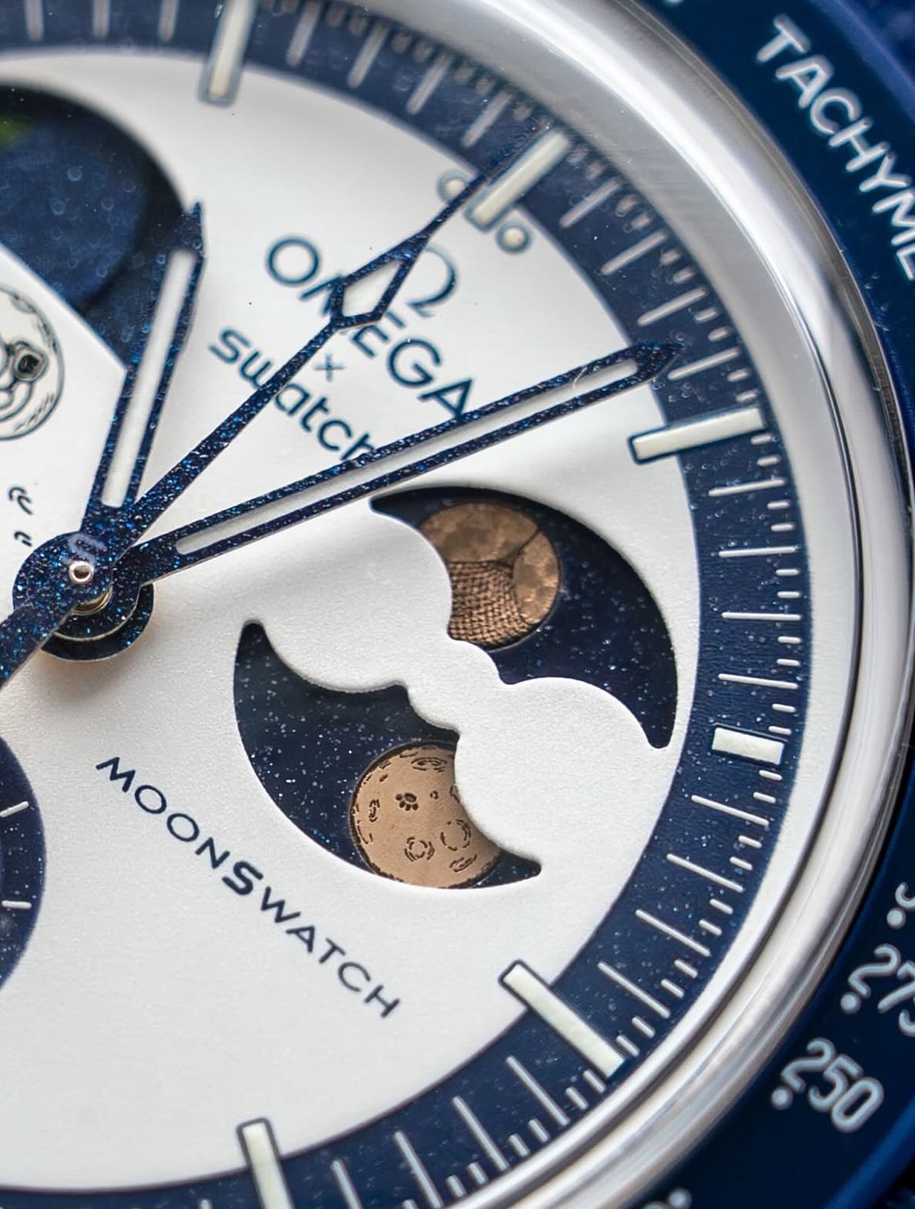 Created in collaboration with OMEGA, the Bioceramic MoonSwatch Collection is a playful and realistic version of OMEGA's legendary Speedmaster Moonwatch, the first watch on the moon. However, what catapults this collection into orbit is the fusion of the innovative Bioceramic material in rare colors with key design elements from the Speedmaster Moonwatch.