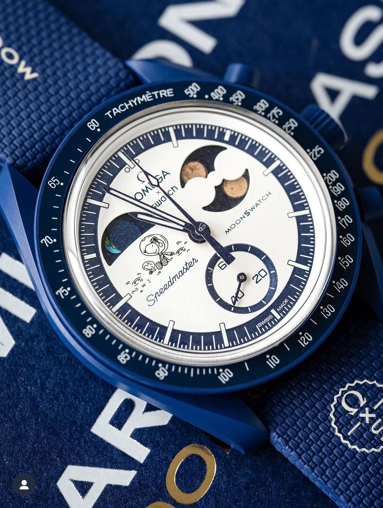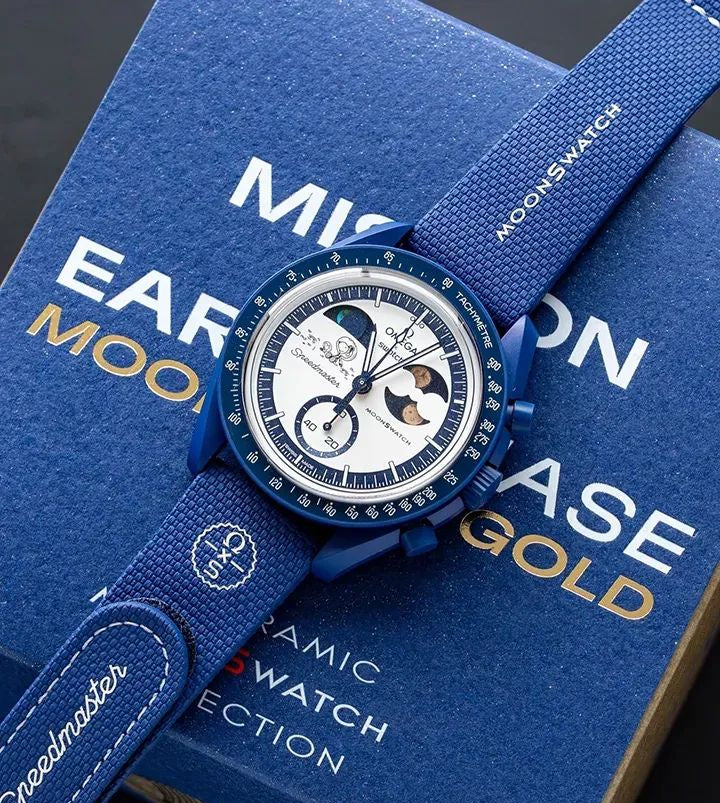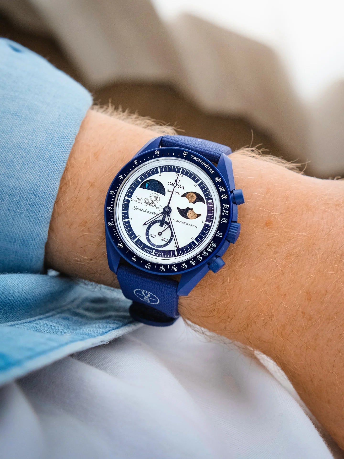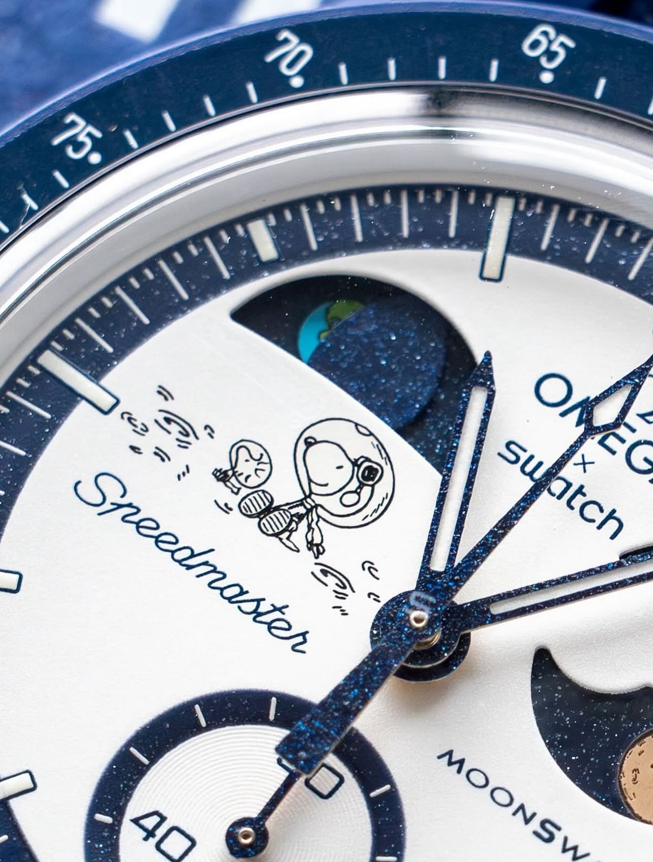 A tribute to the beauty of our planet seen from space. The Earthphase features a white dial with Earth and Moon phases, sparkles that appear under UV light, and refined Moonshine™ Gold details. In a deep navy blue, featuring Snoopy and Woodstock exploring the cosmos, this MoonSwatch is an intergalactic work of art and a must-have for collectors.