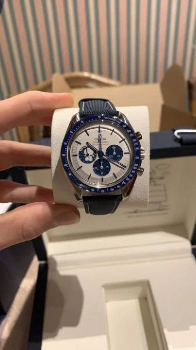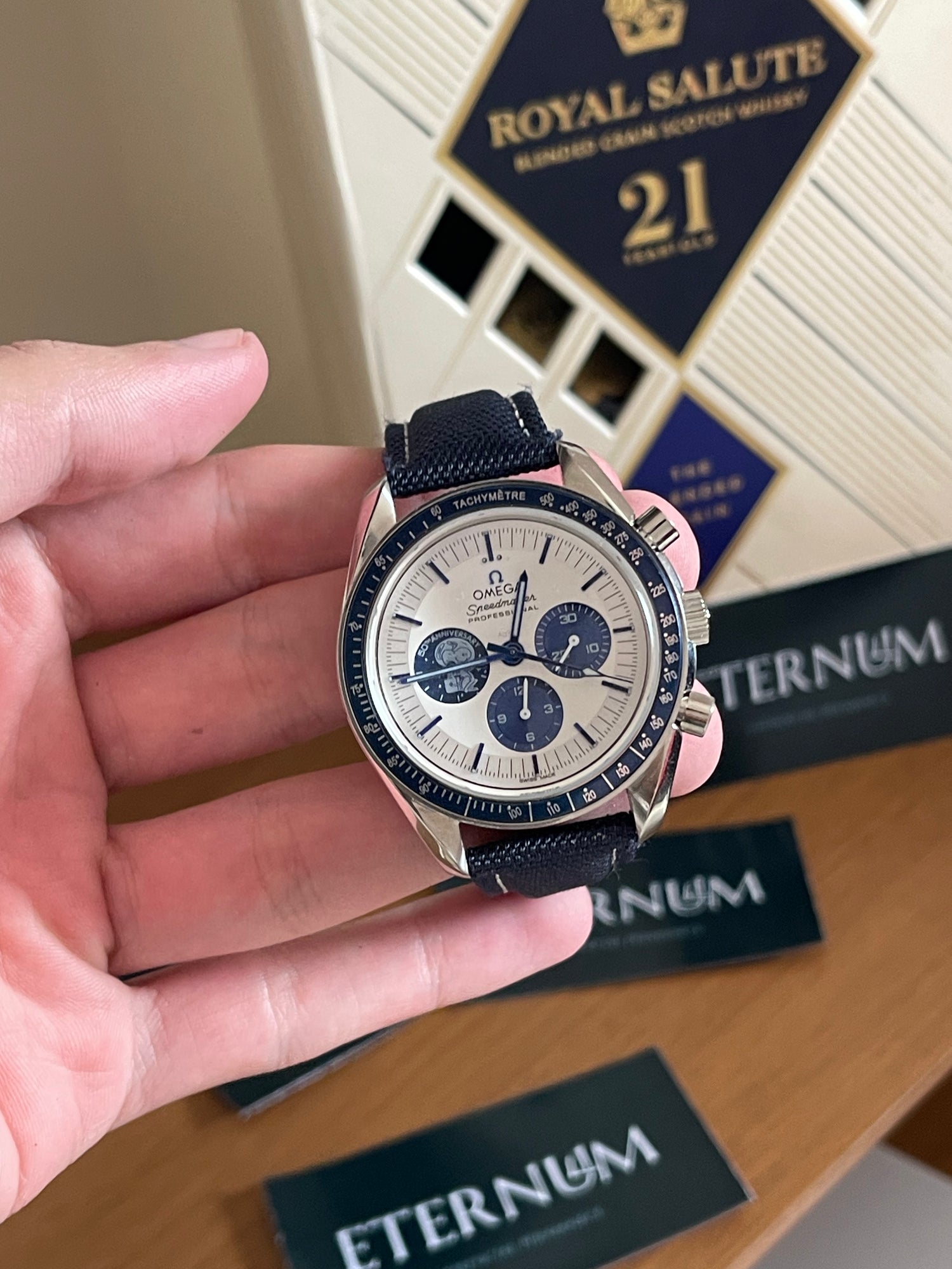 The legendary tachymeter scale appears in white enamel on a blue ceramic [ZrO2] bezel and includes a tribute to the Speedmaster's history with a dot over the number ninety. The color scheme continues on the silver dial with blue PVD hour markers and angled hands.
