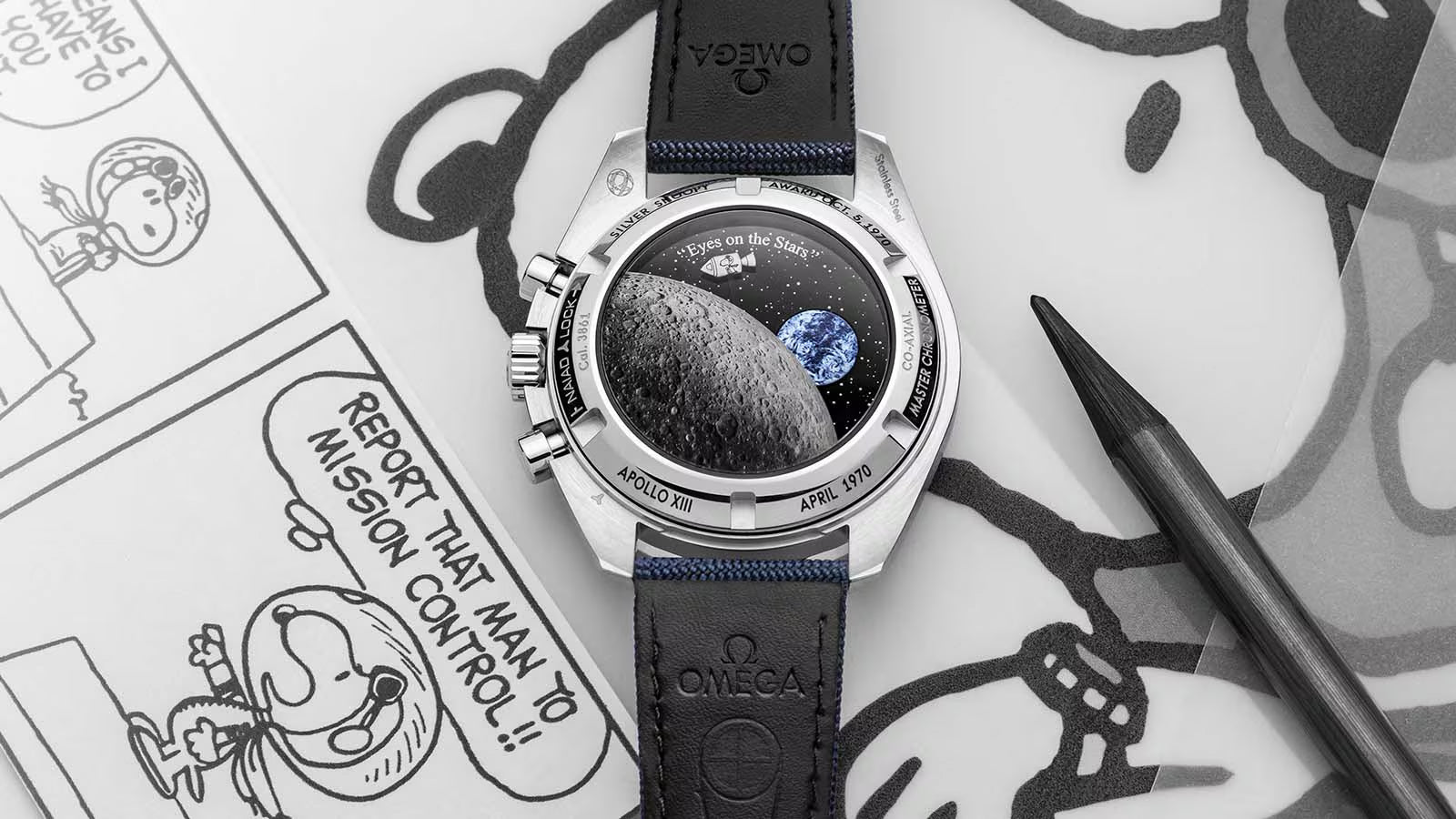 On the caseback, Snoopy appears inside his Service Module (CSM) on a magical hand. When the chronograph seconds hand is used, Snoopy embarks on a journey to the far side of the Moon, which has been decorated on the sapphire crystal with a unique microstructured metallization process. Also present is an Earth disc that rotates once per minute in sync with the watch's small seconds hand.